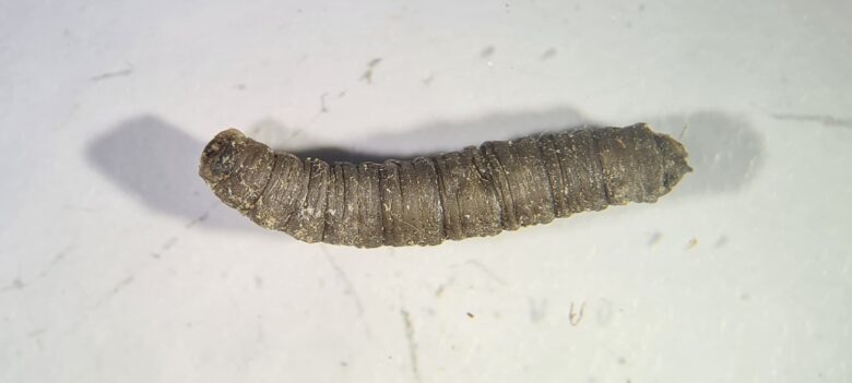 De emelten hebben een lengte van 2-3 cm, zijn grauw van kleur, wormvormig met vooral aan het achterlijf een aantal stompe uitsteeksels. Ook duidelijk te zien aan het achtereinde van de larven, zijn de openingen van het ademhalingssysteem. De openingen lijken enigszins op ogen.