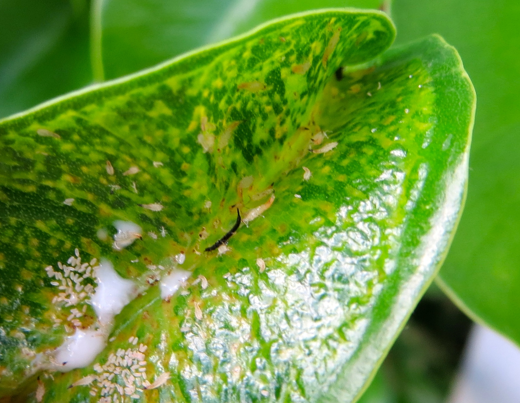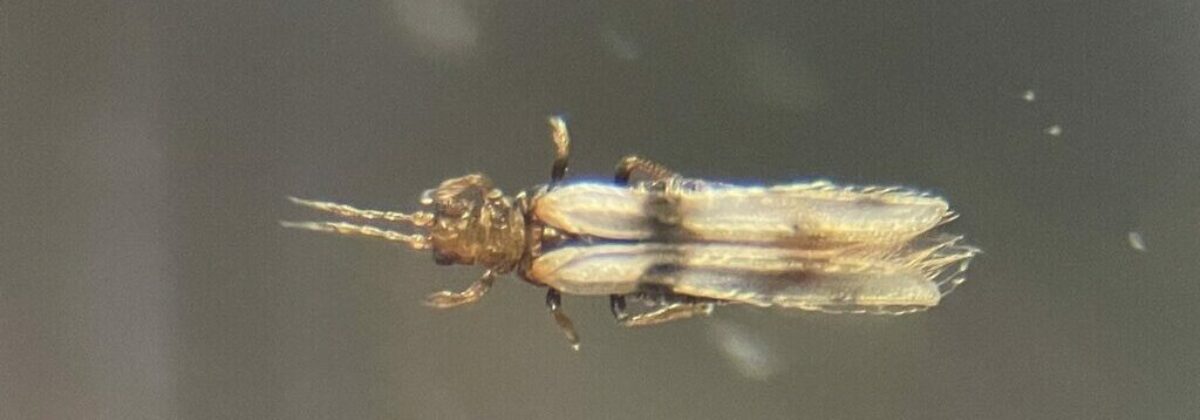 Een typisch schadebeeld aan bladeren: te zien zijn de vele, witachtige vlekjes op het blad en de verschillende stadia van de trips.